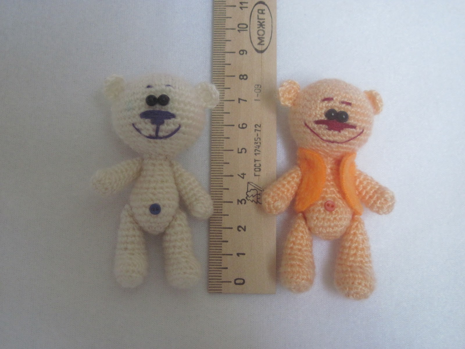 Вязать мне все-таки нравится больше, чем шить. Наверное потому, что шитые игрушки выходят кривоватенько. Во время обеденных перерывов за неделю связала мишек малышек. Пряжа акрил, ростом 7,5см.